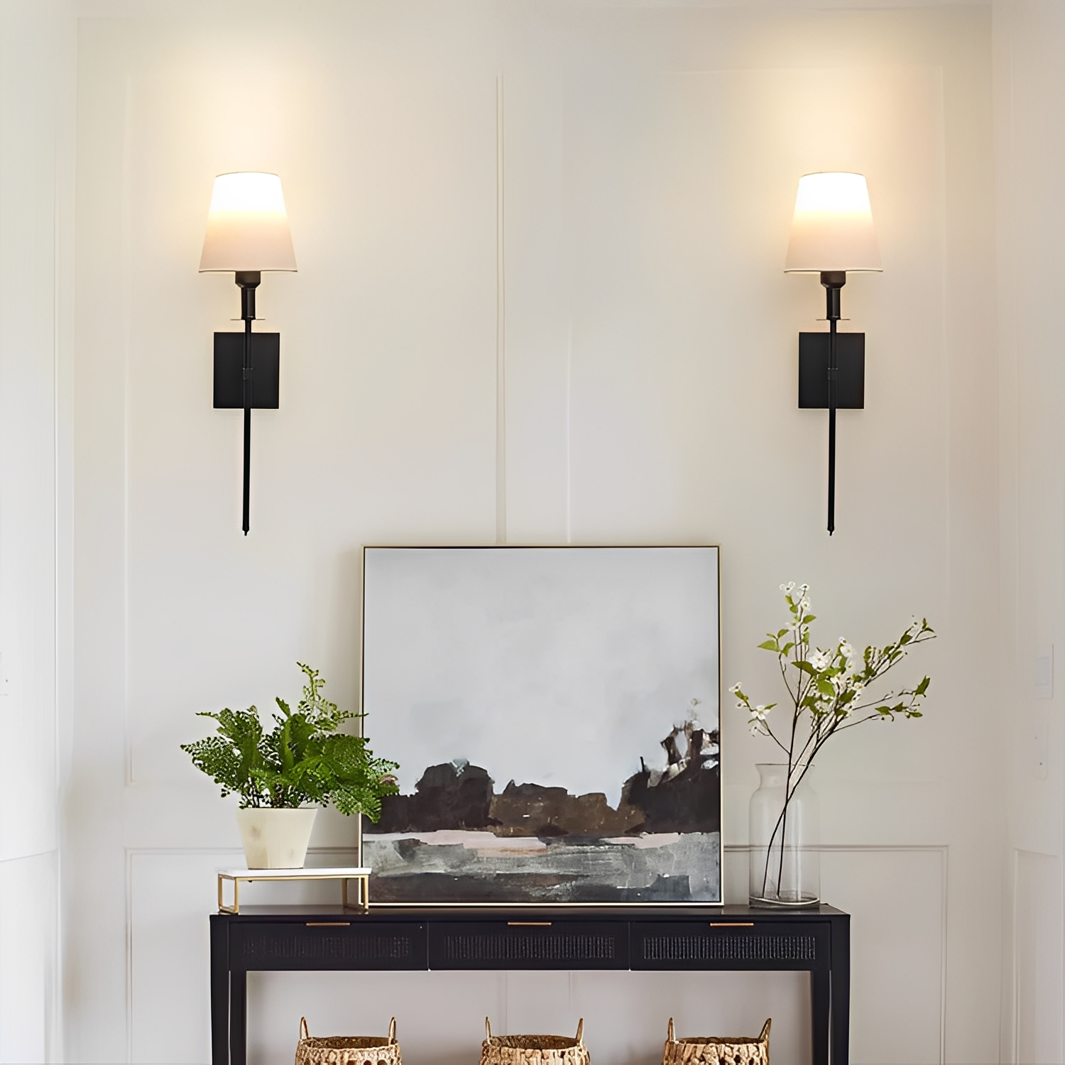 Mit Elara gestalten Sie eine schicke und praktische Lichtlösung für Schlafzimmer, Büro oder Wohnzimmer. Diese schicke Wandlampe vereint einen Stoffschirm mit einem robusten Gestell aus Schmiedeeisen und sorgt für gemütliches Licht – perfekt zum Lesen oder Ausruhen. Egal ob am Bett, im Arbeitsbereich oder in Hotels – Elara überzeugt mit klassischem Design und Vielseitigkeit.