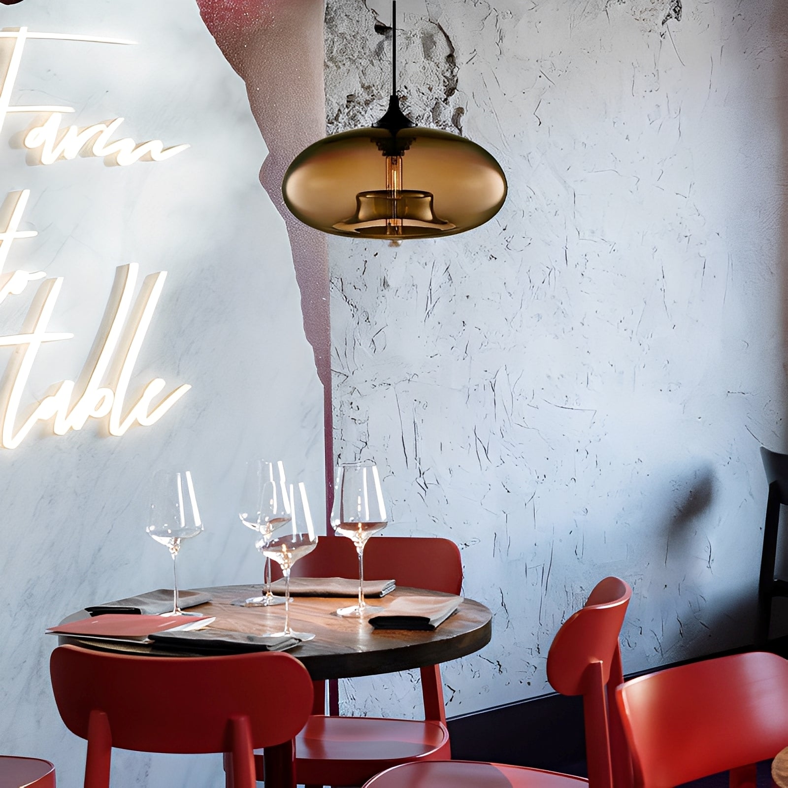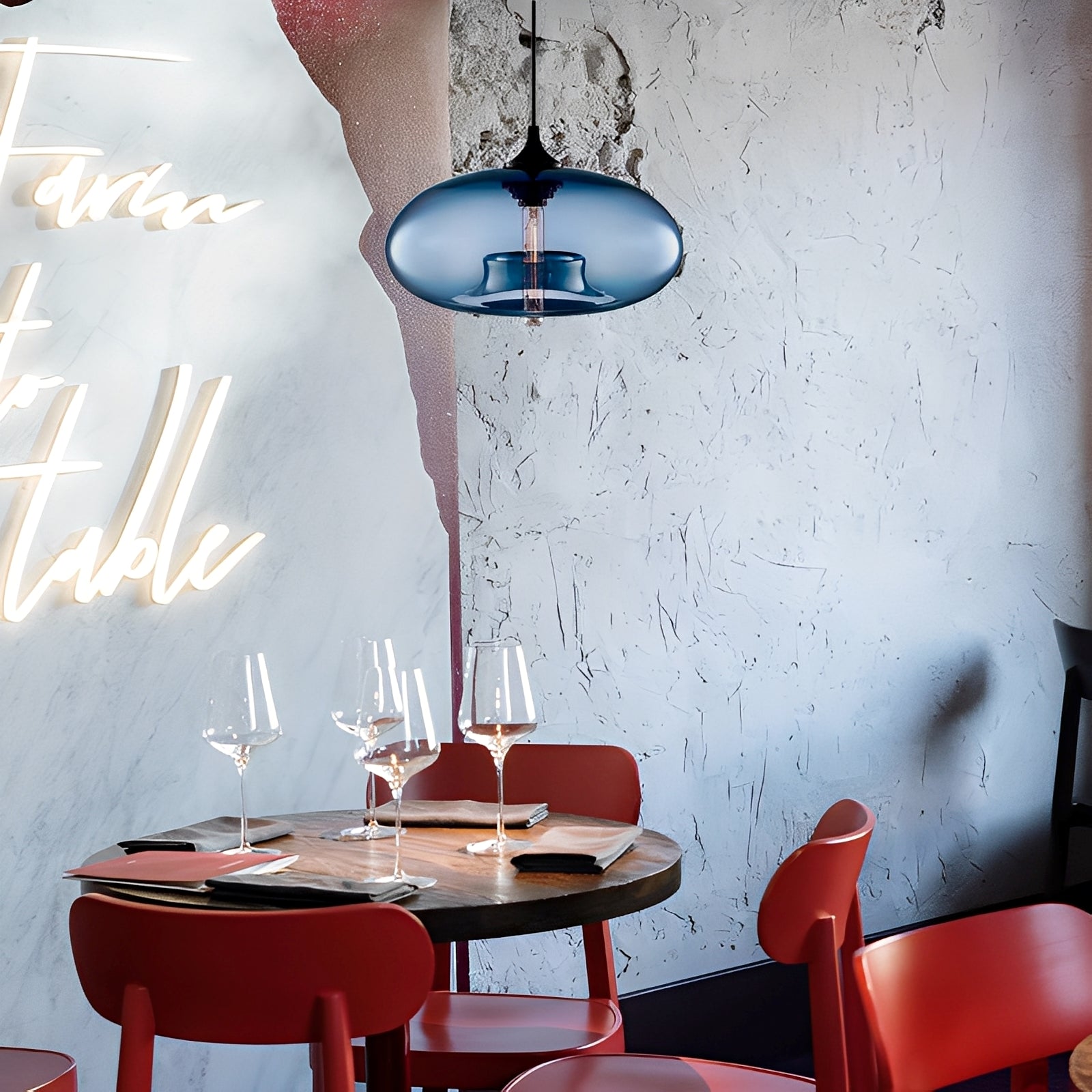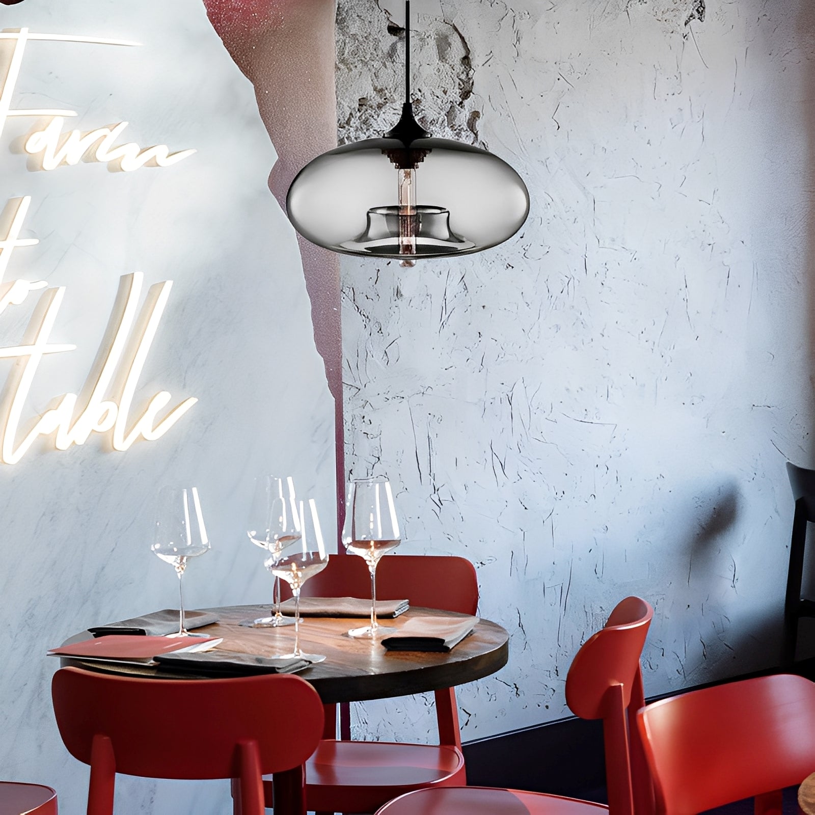 Verfügbar in sechs trendigen Farben – Klar, Rot, Bernsteinfarben, Rauchgrau, Himmelblau und Braun – bietet Marisa viele Gestaltungsmöglichkeiten. Mit einer verstellbaren Aufhängung bis zu 1 m und einer leistungsstarken 40W-Lichtquelle kombiniert sie Funktion und stilvolles Design optimal.