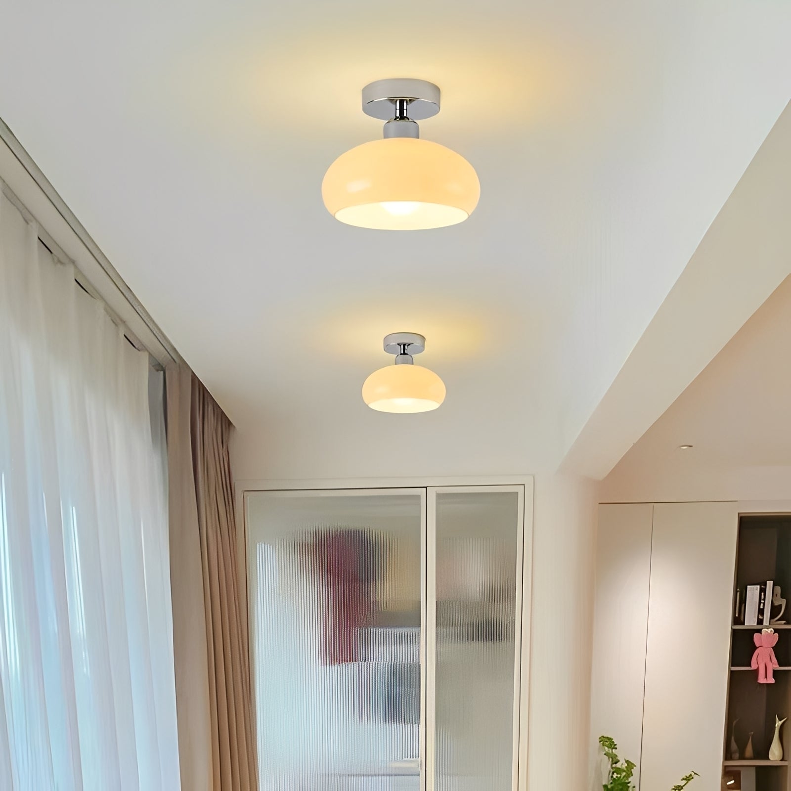 Nami kombiniert einfaches Design mit praktischer Beleuchtung. Ihre klare Form und die Mischung aus Glas und Eisen machen sie zur perfekten Wahl für Flure, Eingänge oder kleine Zimmer.