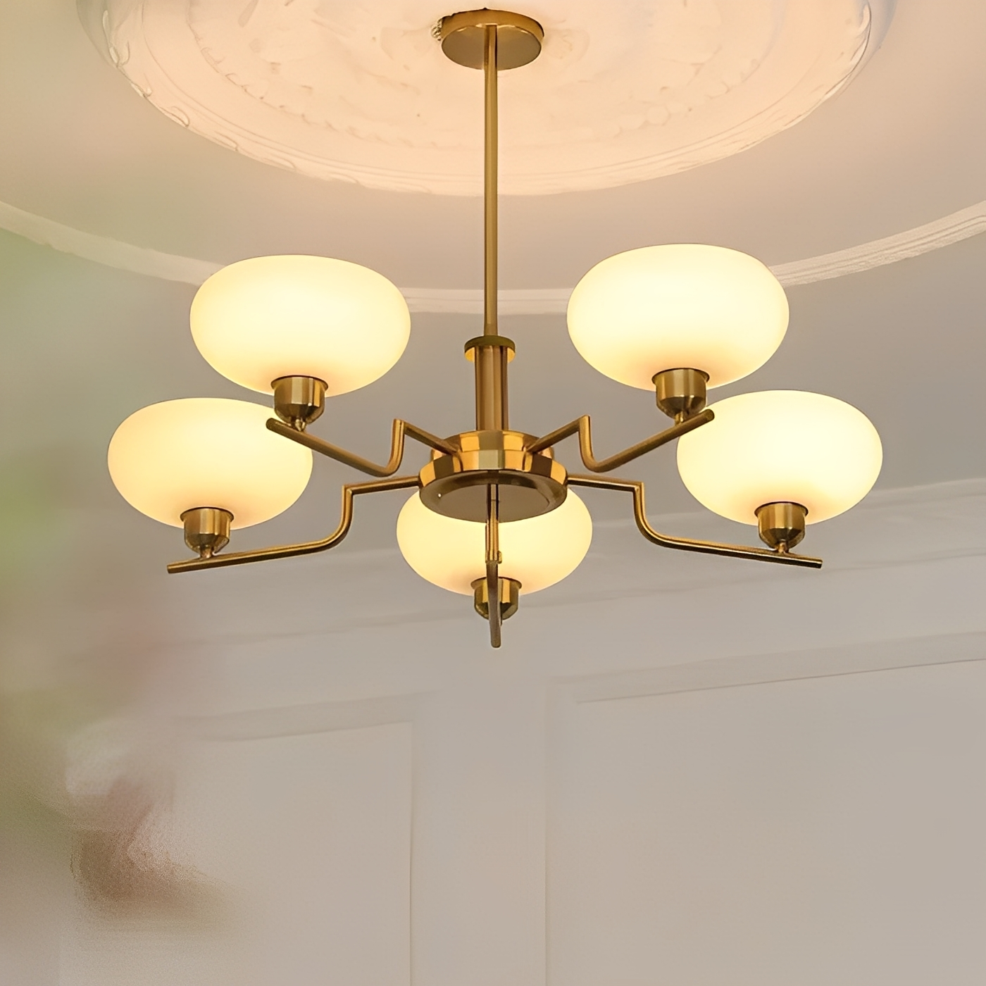 Modelle: 3- oder 5-flammig mit milchweißen oder custardfarbenen Schirmen (inkl. Staubschutz)